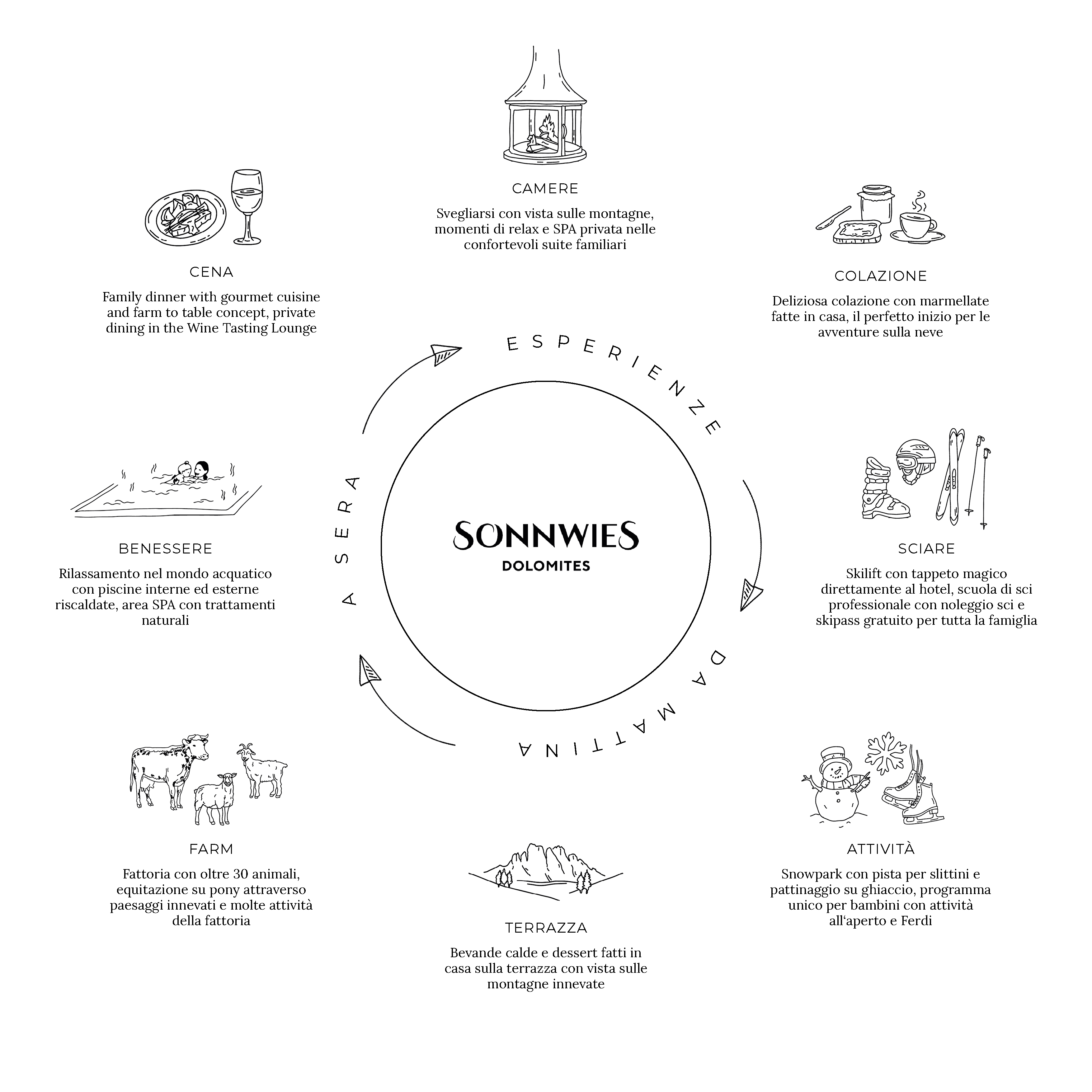 Quando la natura circostante si trasforma in un bianco, tranquillo e affascinante paesaggio invernale, allora l'inverno è arrivato al Sonnwies. Questa stagione invernale sorprende con molte novità che rendono ancora più speciale il tempo trascorso in famiglia nelle Dolomiti.